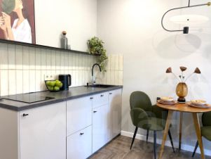 - Кухонный гарнитур (микроволновая печь, индукционная варочная плита на 2 комфорки, небольшой, но очень вместительный холодильник с отдельной морозильной камерой, электрический чайник, необходимая посуда).