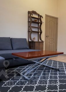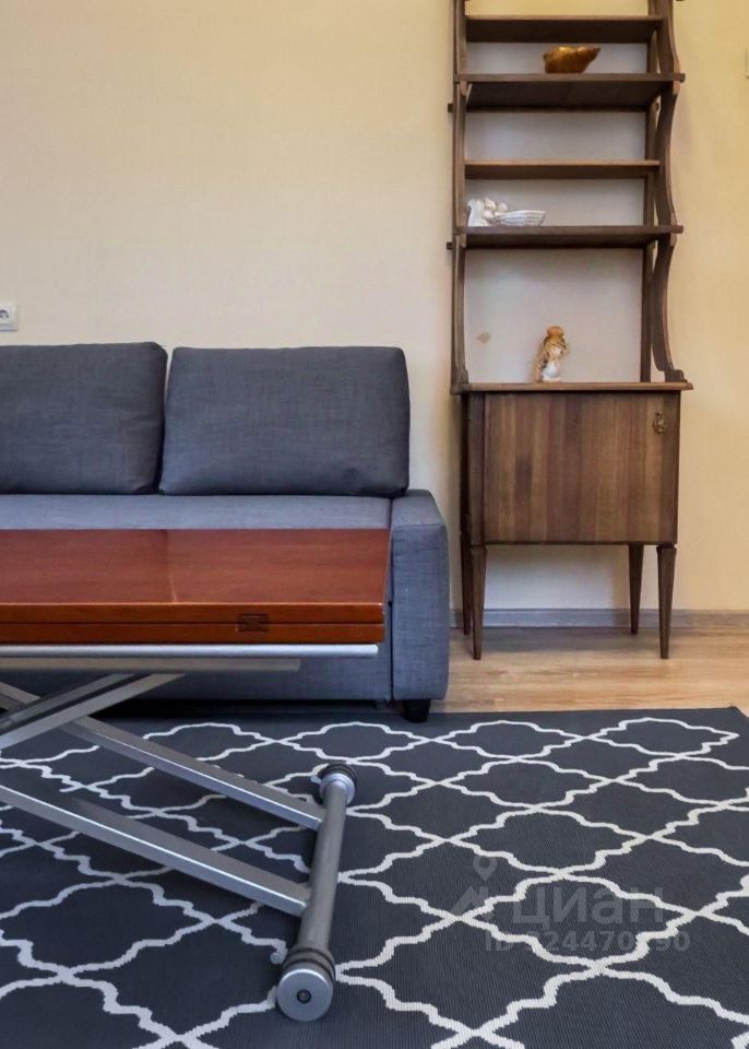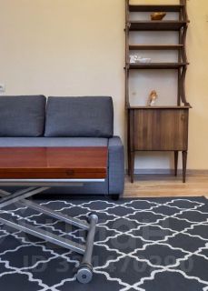 Гостиная: Просторная комната с удобным угловым серым диваном (раскладывается для двух спальных мест), журнально-обеденным столиком (трансформер по высоте и размеру) и стильным деревянным комодом/этажеркой, сделанным на заказ из массива. Пол — ламинат, на полу — красивый ковер.