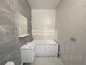 - в просторном санузле установлена ванна; крупноформатная плитка под мрамор с акцентной стеной, удобная подвесная тумба под раковину и зеркало;