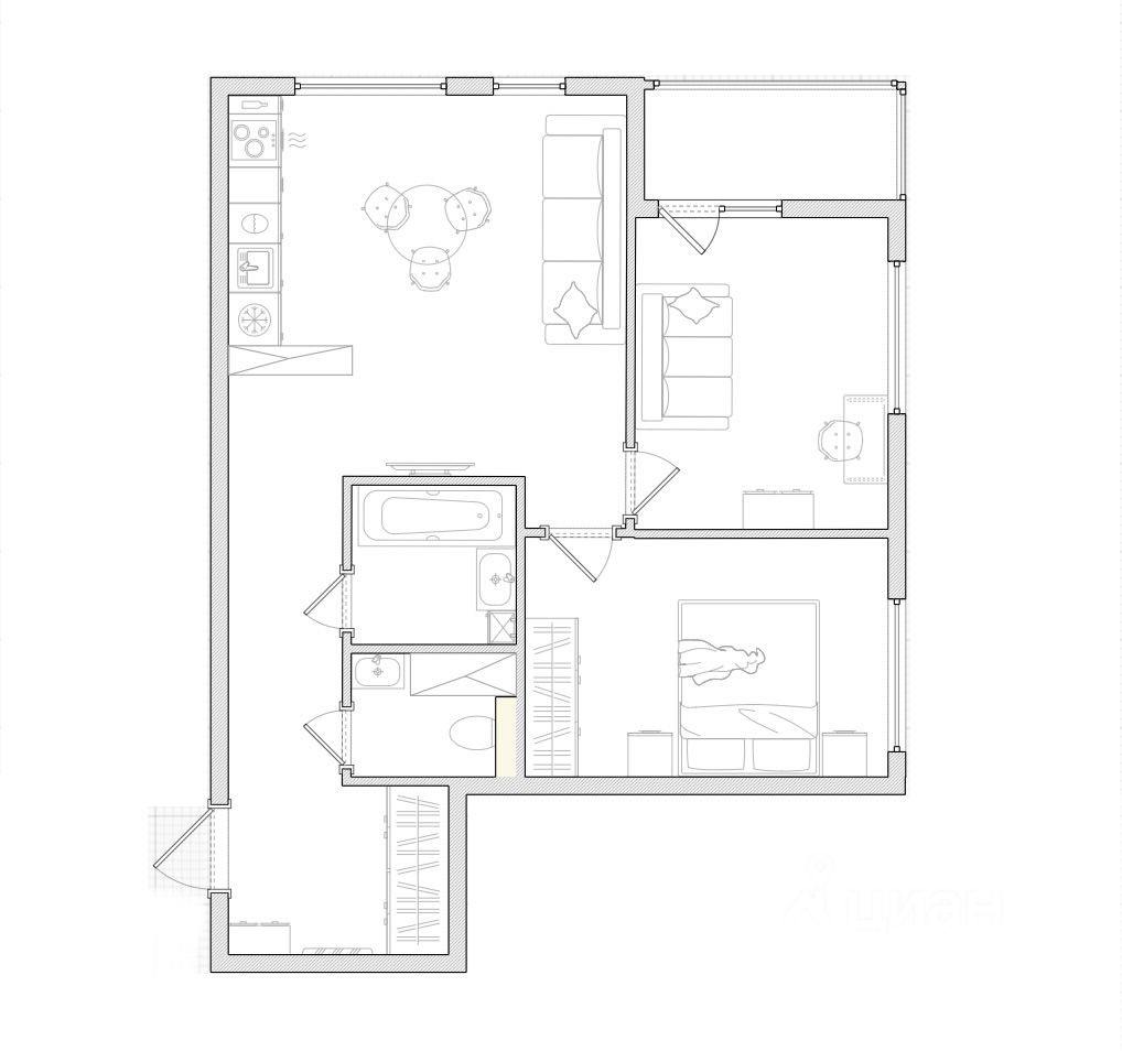 Отдельные две спальни и уютная кухня-гостиная.
