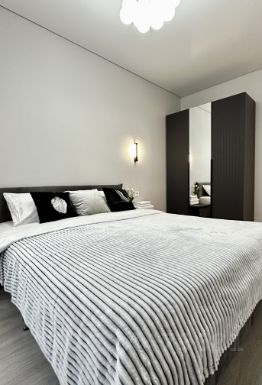 • Двуспальная кровать с ортопедическим матрасом (160x200). Диван во второй комнате раскладывается в полноценное двуспальное место с ортопедическим основанием.