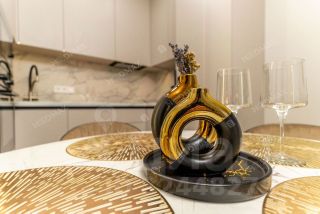 Полноценная кухонная зона со всем необходимым: встроенный холодильник, встроенная посудомоечная машина, встроенная микроволновая печь, духовой шкаф, варочная панель, вытяжка, фильтры для воды (красивая посуда, стильный сервиз, чайник, пылесос, утюг, гладильная доска и стремянка).