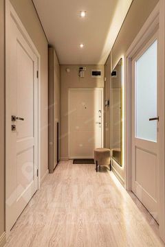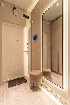 Удобная прихожая в коридоре с большим шкафом, зеркало с подсветкой.