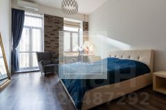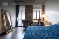 Уютная спальня с большой кроватью и рабочим местом, с просторной гардеробной и выходом на балкон, откуда открывается вид на крыши города. Совмещенный санузел с душевой кабиной. Светлая кухня со встроенной техникой.