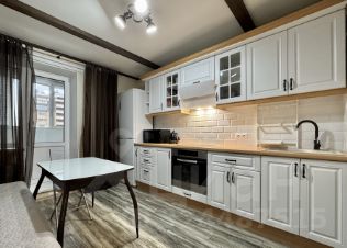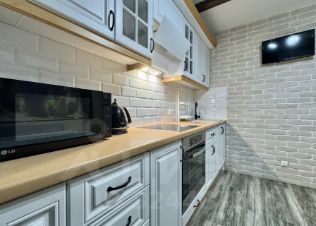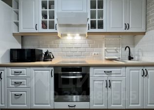 - современная встроенная кухня с микроволновой печью, варочной поверхностью и духовым шкафом, холодильником, вытяжкой и подсветкой,