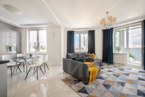 На кухне и сан узлах полы с подогревом из керамогранита. В комнатах - ламинат.