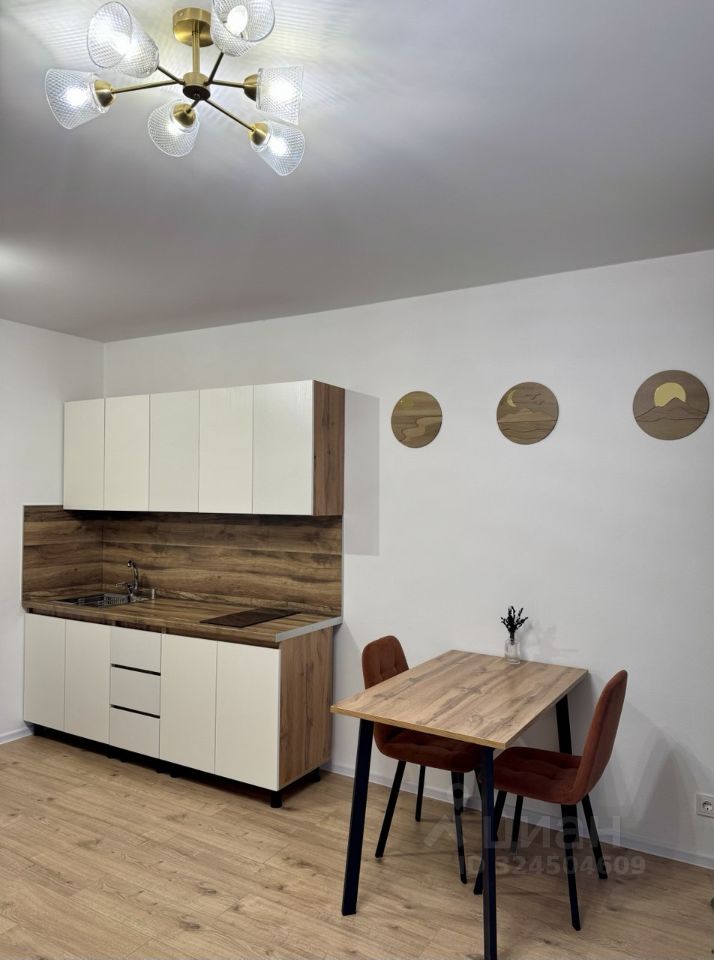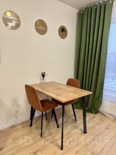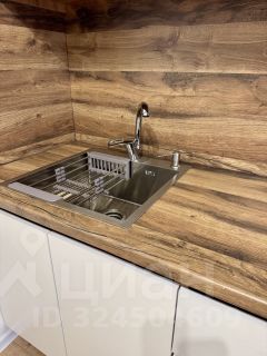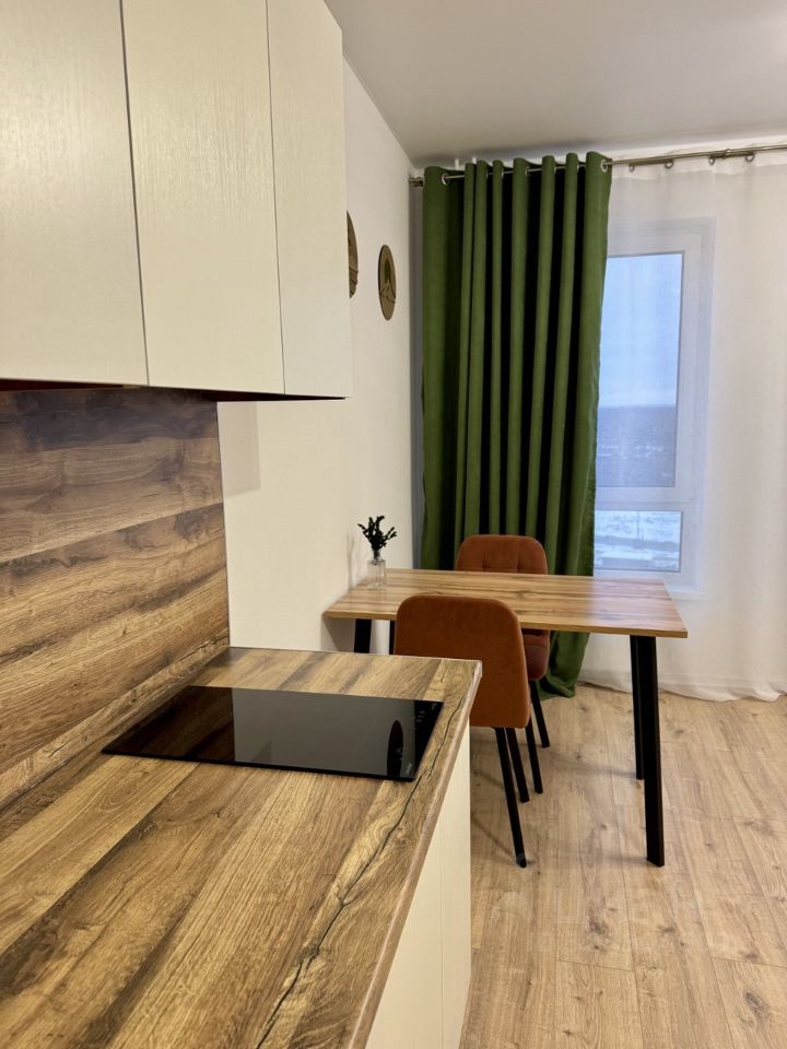Оснащение квартиры: кухонный гарнитур, варочная панель, микроволновка, чайник, раскладной двухместный диван, два стола со стульями, стиральная машинка, вместительный шкаф. Все предметы абсолютно новые, в квартире никто не жил. Просторная комната правильной квадратной формы, два огромных окна, много света, высокий этаж.
