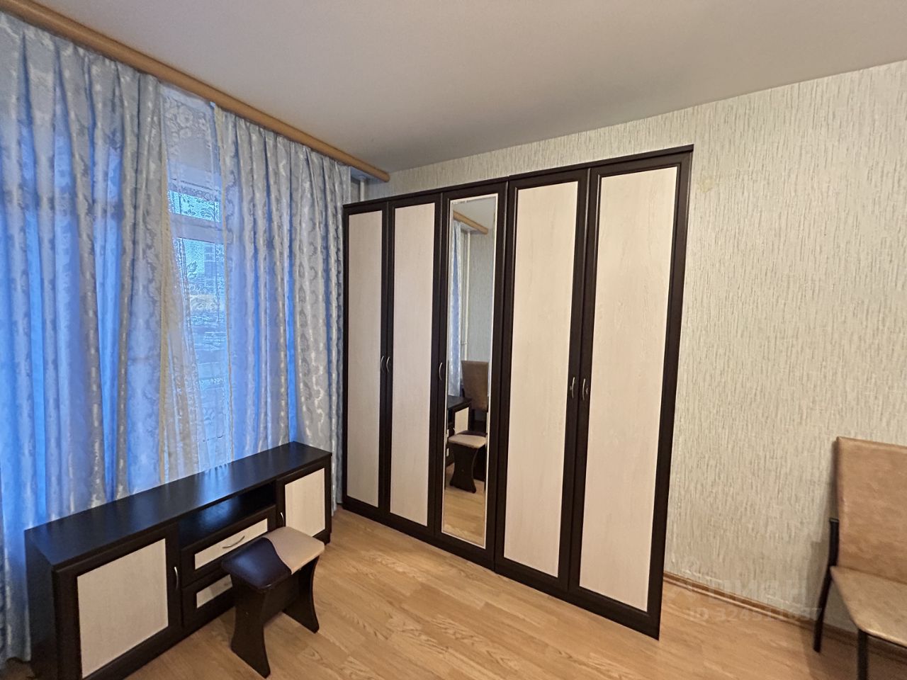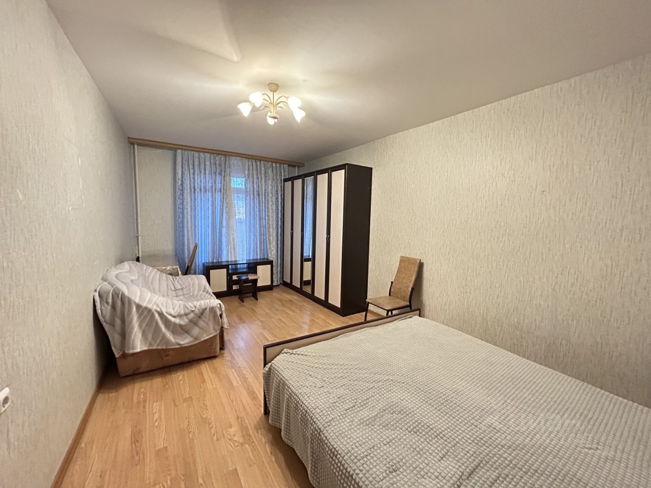 В квартире есть необходимая для комфортной жизни мебельи бытовая техника, в комнате двуспальная кровать и небольшой диван, шкаф для хранения.