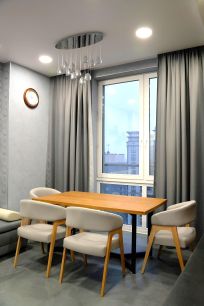 В гостиной два огромных окна, телевизор, диван (раскладывается на два спальных места), оборудованная зона под кабинет, рабочий стол из массива дуба.