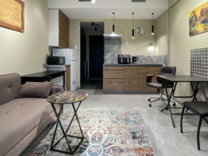 Апартамент расположен на 12 этаже, полностью новый. Выполнен качественный ремонт, панорамные окна в пол, высокие потолки 3м. Кухня-гостиная, отдельная спальня с большой кроватью, вместительный шкаф в прихожей, совмещенная ванная комната. Есть вся необходимая бытовая техника для комфортного проживания: большой холодильник Liebherr, посудомоечная машина, аэрогриль Ninja и сейф.