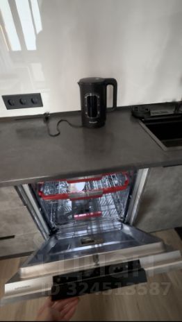Обустроенная кухня-гостинная с полным комплектом мебели и импортной бытовой техники: посудомоечная машина, посуда, индукционная плита, холодильник и места для хранения.
