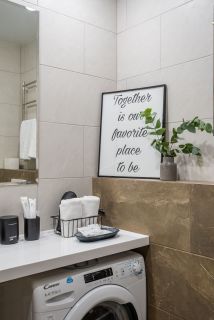 - ванная комната с просторной душевой кабиной и тропическим душем. В квартире установлены стиральная машина, бойлер, полотенцесушитель.