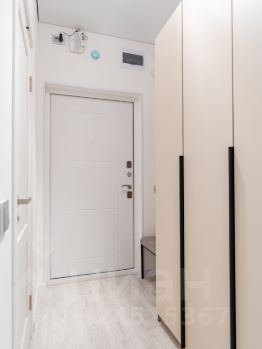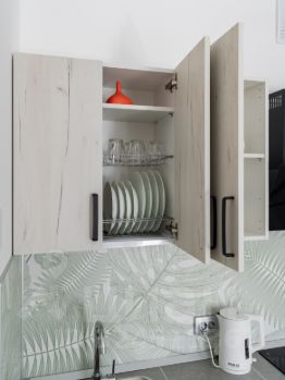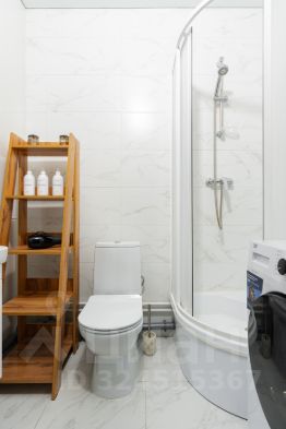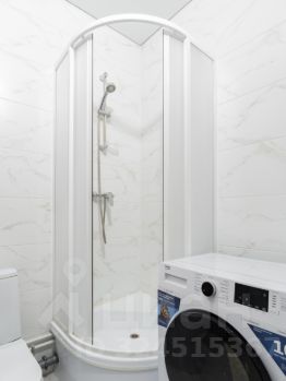 В квартире — удобная планировка, современный интерьер в светлых тонах, стиральная машина, телевизор, кухонная зона с техникой.
