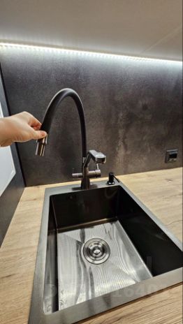На кухне: большой вместительный холодильник, посудомойка, 3-х конфорочная индукционная панель и посуда для нее, духовка, гибкий кран с фильтром, раскладной обеденный стол, все необходимые столовые приборы.
