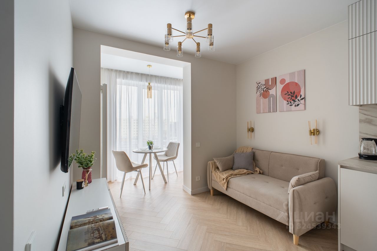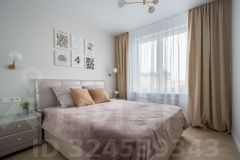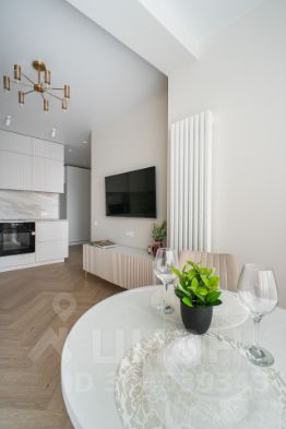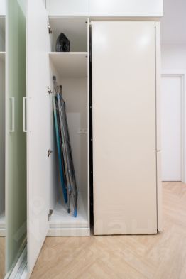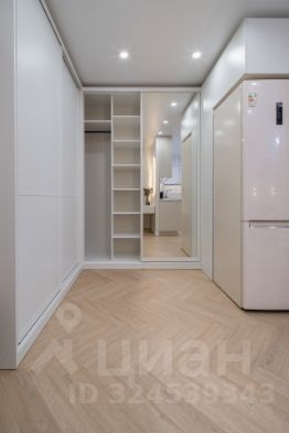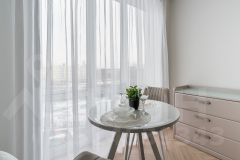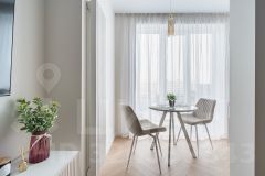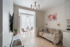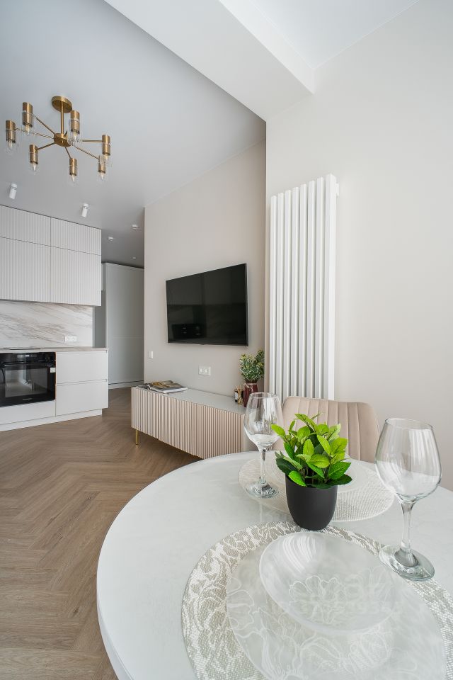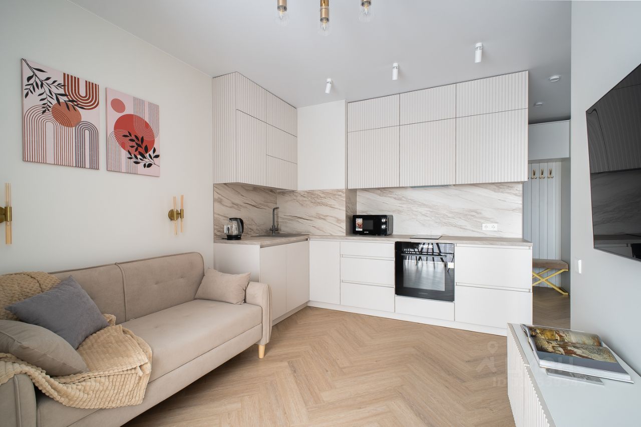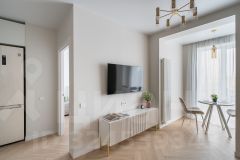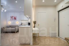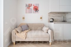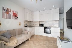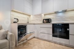 Квартира представляет из себя просторную гостиную, совмещенную с кухней, сделанной под заказ, спальню с вместительным шкафом, а также полноценный шкаф-гардеробную.