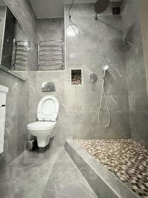 — первый с очень широкой ванной (примерно вдвое больше стандартной), облицован керамогранитом 12060;