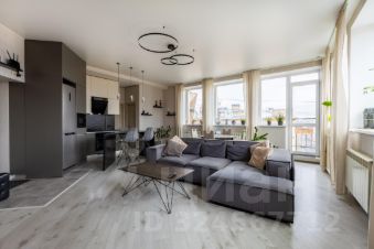 • просторная гостиная-кухня с большим диваном, обеденной зоной и панорамными окнами;