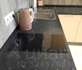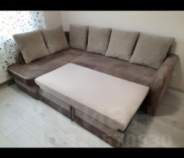 Большая кухня- гостиная с угловым раскладным 2- спаьным диваном, TV, застекленным балконом. Встроенная кухня с варочной панелью, СВЧ, чайником, посудой, большим 2- камерным холодильником. Раздвижной стол- обеденная и рабочая зона.