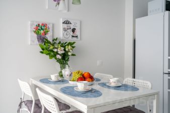 -кухня с современной бытовой техникой: индукционная плита, электрочайник, СВЧ, посудомоечная машина, духовка, набор необходимой посуды;