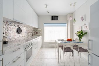 Квартира находится на высоком первом этаже, просторная, светлая и очень тихая, с современным ремонтом, бытовой техникой и отдельной просторной гардеробной.
