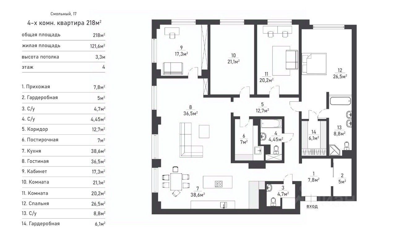 Три просторные спальни (с возможностью организации четвертой спальни в кабинете)