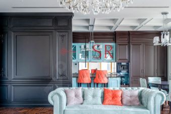 - огромная гостиная объединенная с кухней и панорамным остеклением,