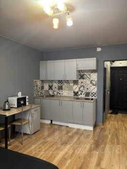 Сдаётся уютная студия на 6 месяцев в современном монолитном доме, расположенном на 18 этаже из 25. Общая площадь квартиры составляет 24,5 кв. м, жилая — 18 кв. м. Квартира находится в новом доме 2019 года постройки, всего в 7 минутах на машине от метро Купчино.