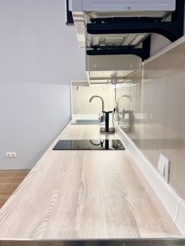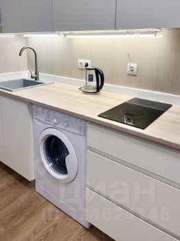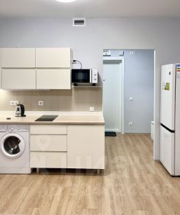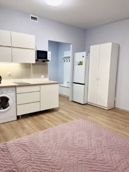 Планировка грамотная и функциональная: комфортная кровать с новым матрасом , кухонный уголок со всей необходимой техникой (холодильник, варочная панель, стиральная машина), два вместительных шкафа и обеденная зона.