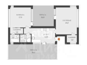 а также просторную гостиную, из которой есть выход на террасы и доступ в отдельный комнату площадью 2.5 м², которое можно использовать как кабинет или кладовую.