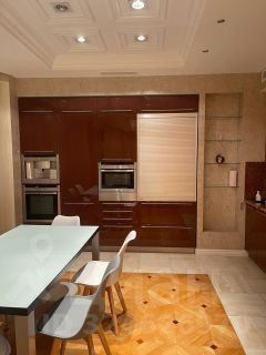 Просторная кухня-гостиная, оснащённая современной техникой. Обеденная зона объединена с зоной отдыха, при необходимости пространства могут быть зонированы раздвижной перегородкой.