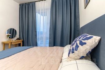 В спальне имеется большая 2-спальная кровать с удобным матрасом, косметическим столиком, французскими прикроватными тумбами и покрывалами.
