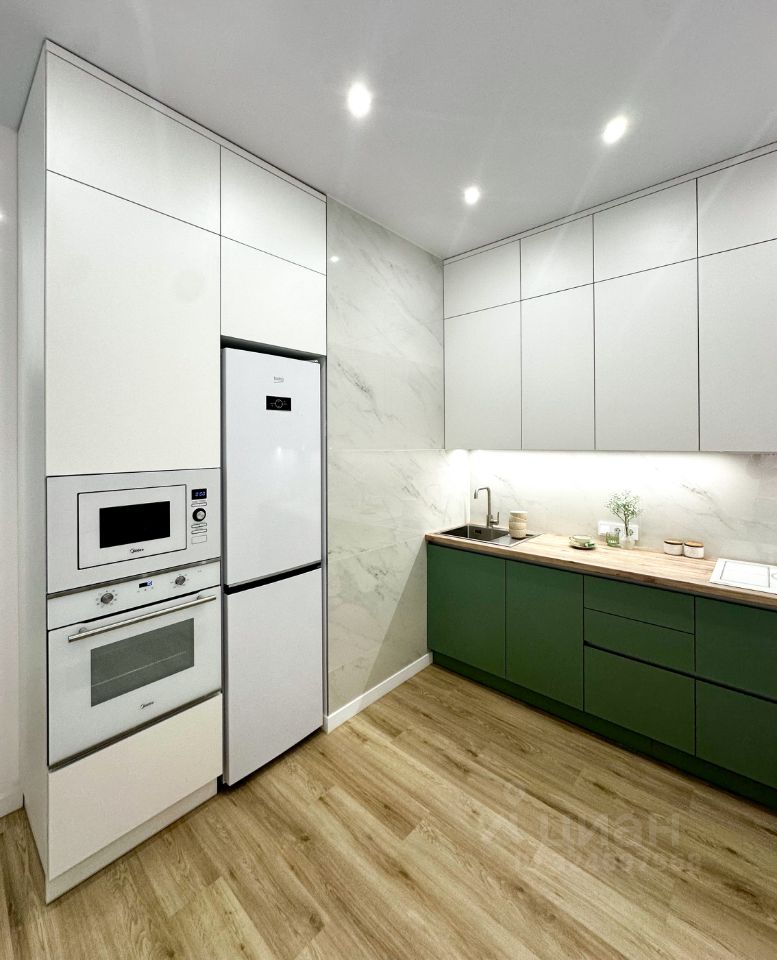 Кухня с современной техникой: вытяжка, холодильник, индукционная плита, духовой шкаф, микроволновая печь, посудомоечная машина, чайник и утюг, установлен кондиционер;
