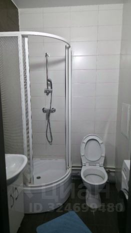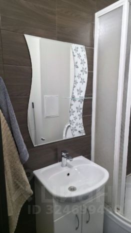 Сан узел стандартный, поддон\ душ. Зеркальце и раковина с шкафчиком.