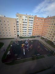 Окна во двор, двор без машин. Во дворе детская площадка, турники.
