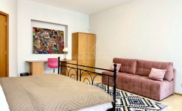 Квартира расположена на 4-м этаже 5-этажного дома (лифт). Четыре изолированных спальни и большая гостиная. Подойдет для размещения до 16-18 человек. Два санузла (один с ванной, второй с душем), два балкона. Окна выходят во двор.