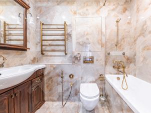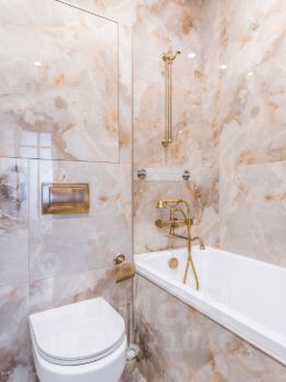 Совмещённый санузел, отделанный крупноформатной мраморной плиткой, с инсталляцией и гигиеническим душем.