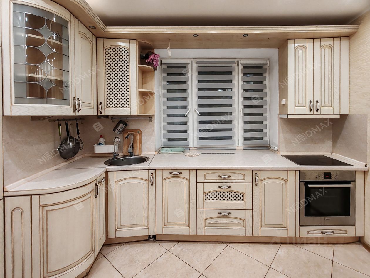 Просторная кухня оборудована всей необходимой бытовой техникой: холодильник, посудомоечная машина, духовой шкаф, варочная панель. Зона готовки продумана так, что можно любоваться в окно красотою пейзажа на реку Смоленку.