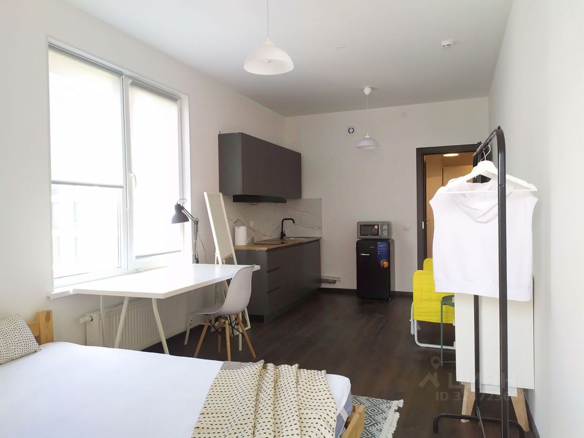 Общая площадь квартиры составляет 28 квадратных метров. Планировка выполнена в формате студии с двумя окнами. Для комфорта жильцов предусмотрена бытовая техника: холодильник, стиральная машина, микроволновая печь и индукционная плита. Также имеется лоджия, что расширяет жилое пространство.