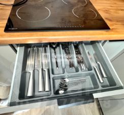 В квартире выполнен современный ремонт из качественных материалов. Просторная кухня-гостиная, площадью 20 м2, оснащена встроенной техникой бренда Weissgauff- посудомоечная машина, холодильник, духовой шкаф, варочная поверхность, микро волнованная печь, полный набор кухонных принадлежностей и посуды, телевизор, раскладной диван, трансформирующийся в дополнительное спальное место.