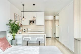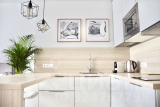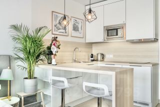 Компактная кухня, оборудованная всей необходимой техникой, включая посудомоечную машину, рабочая зона, зона отдыха, панорамное остекление с видом на город, совмещенная ванная комната с душевой кабиной.