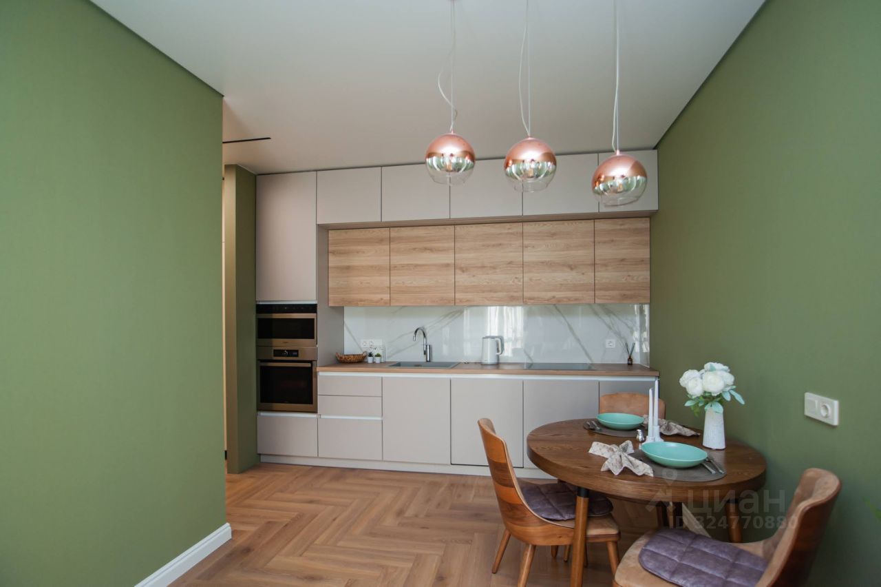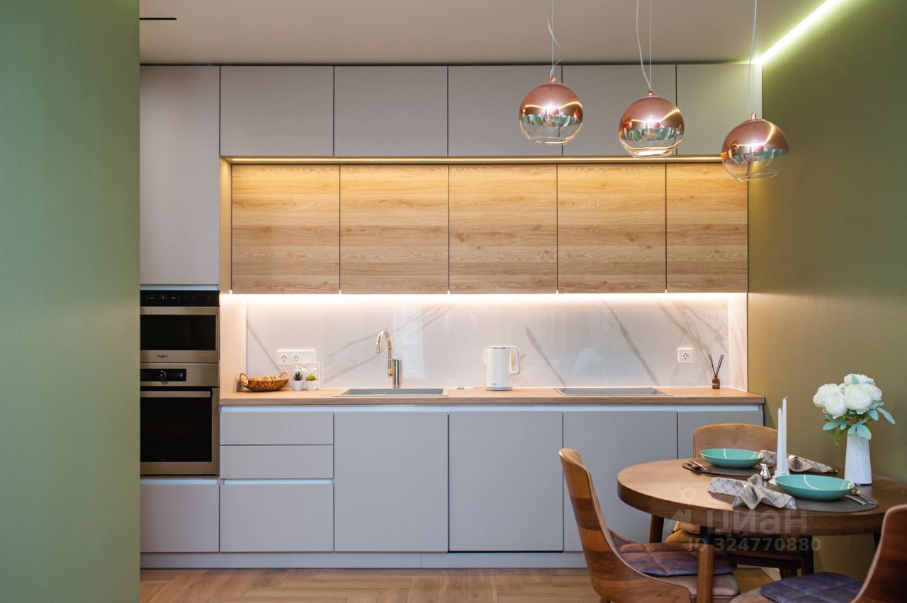 Современная кухня-гостиная с качественной мебелью и встроенной техникой: холодильник Haier, посудомоечная машина и варочная панель Bosch, духовой шкаф и СВЧ Whirlpool, измельчитель пищевых отходов In Sink Erator. В гостиной диван, большой smart-телевизор, саундбар Yamaha.