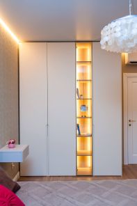 В спальне кровать из натурального шпона фирмы Parra и матрас итальянского бренда Magniflex, а также вместительный шкаф с подсветкой, выполненный на заказ.