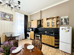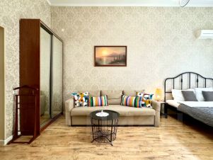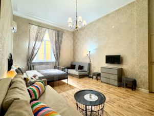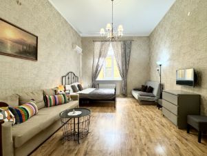 Квартира располагается на 2-м этаже 7-этажного дома (работает лифт), окна выходят в тихий двор. В одной из спален установлен кондиционер. Есть небольшая гардеробная. Три спальни: в каждой двуспальная кровать, раскладывающийся диван, шкаф, телевизор. Два санузла: в одном - ванная и туалет, в другом - гигиенический душ и туалет. Подходит для размещения семьи или компании до 16 человек.