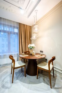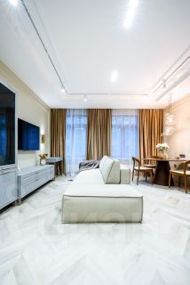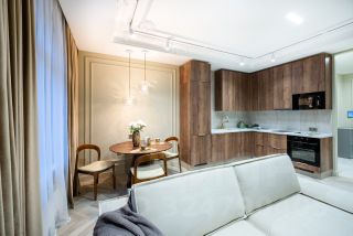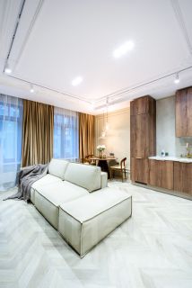- в гостиной - полностью меблированная кухонная и столовые зоны, большой раскладной диван, компактное рабочее место;