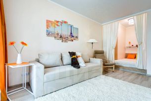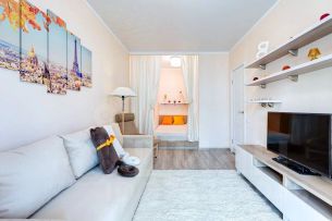 Дизайнерский ремонт, в ноябре выполнен косметический ремонт. Есть все необходимое для проживания. В комнате расположен большой диван, два шкафа,телевизор. Спальное место расположено в нише стены. Рабочее место у окна. Кухня оснащена необходимой мебелью, техникой и посудой - посудомоечная машина, варочная панель, духовой шкаф, холодильник, стиральная машина, электрический чайник. В коридоре есть шкаф для верхней одежды. Имеется лоджия.