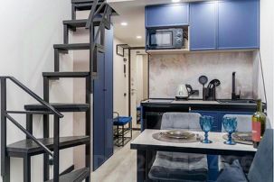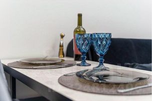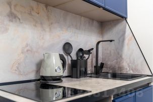 — Оборудованная кухня с посудой, столовыми приборами и встроенной техникой (микроволновая печь, чайник, холодильник, электрическая варочная панель)