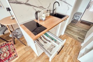 Кухня: кухонный гарнитур, индукционная плита (посуда для индукции в наличие), холодильник, микроволновая печь, чайник, вытяжка, кухонный стол, 2 стула.
