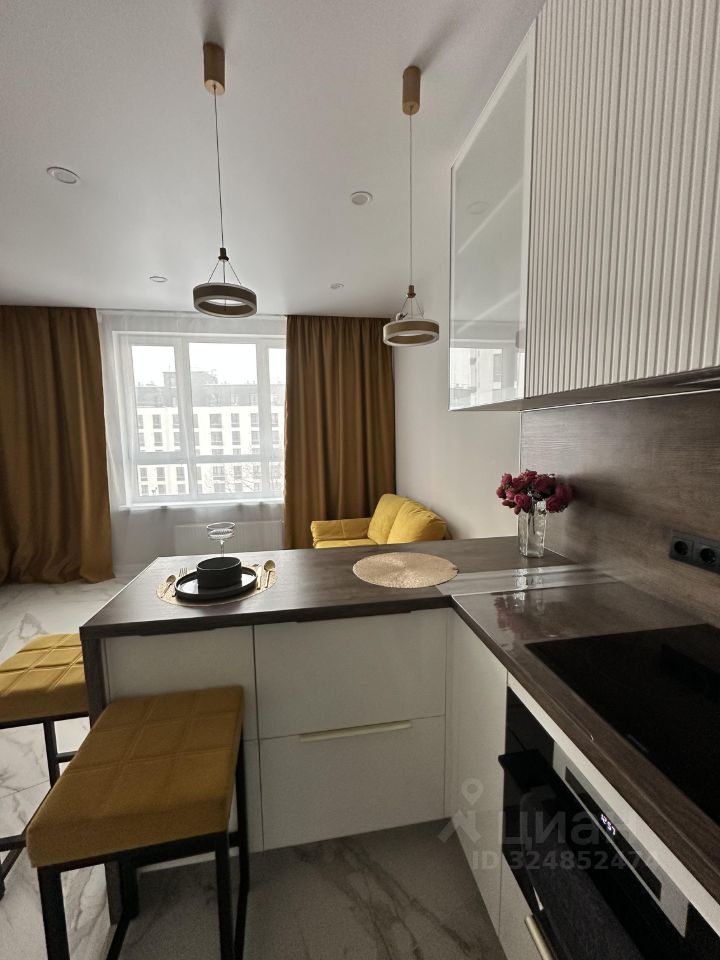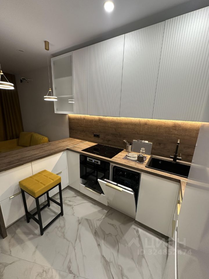 В кухне 4 полу-барных стула, теплый пол, кухня оборудована посудомоечной машиной, духовкой с свч, варочной поверхностью, чайником, посудой для приготовления и приема пищи.