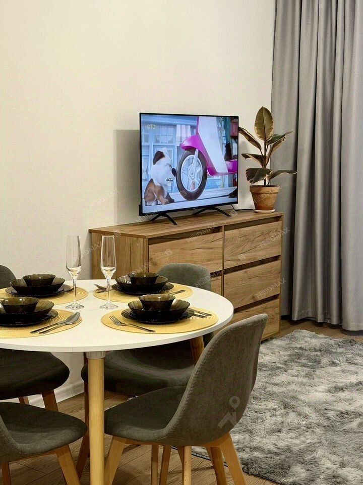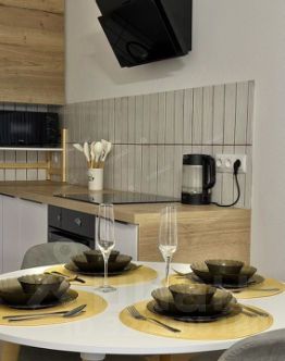 Кухня-столовая: современная кухня с встроенным холодильником, посудомоечной машиной, чайником, микроволновой печью, варочной панелью и всей необходимой посудой и аксессуарами. Удобный круглый стол с четырьмя стульями и уютный раскладной диван — идеальное сочетание для домашнего отдыха и общения.