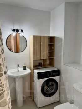 Санузел: современная стиральная машина и шкафчик для хранения моющих средств — всё для вашего удобства.
